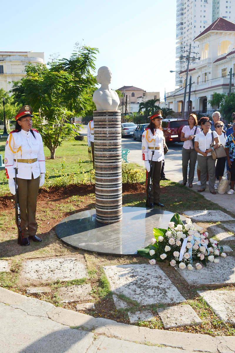 “AL PUEBLO DE LA REPÚBLICA DE CUBA — dice el mármol negro que soporta al monumento— EVA PERÓN -EVITA (1919-1952)/ En homenaje a Eva Duarte de Perón, la mujer argentina que luchó con rebeldía y pasión por la dignidad del pueblo argentino. / Superando humillaciones e injurias, convirtió a las mujeres en ciudadanas y a los humildes en sujetos de derechos. Conquistó el corazón de su pueblo, quien la llamaba, cariñosamente, Evita.”.