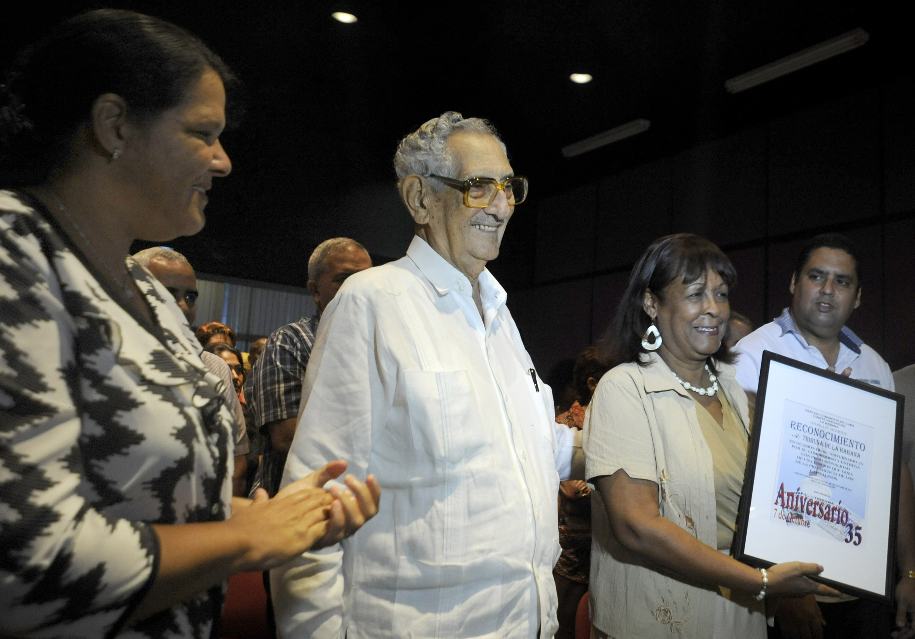 En representación del colectivo, Marta Jiménez Sánchez, su actual directora, recibió un reconocimiento del Buró Provincial del Partido. A su lado, el Comandante del Ejército Rebelde Julio Camacho Aguilera, quien fuera el primer secretario del Partido en la provincia al crearse este órgano de prensa.