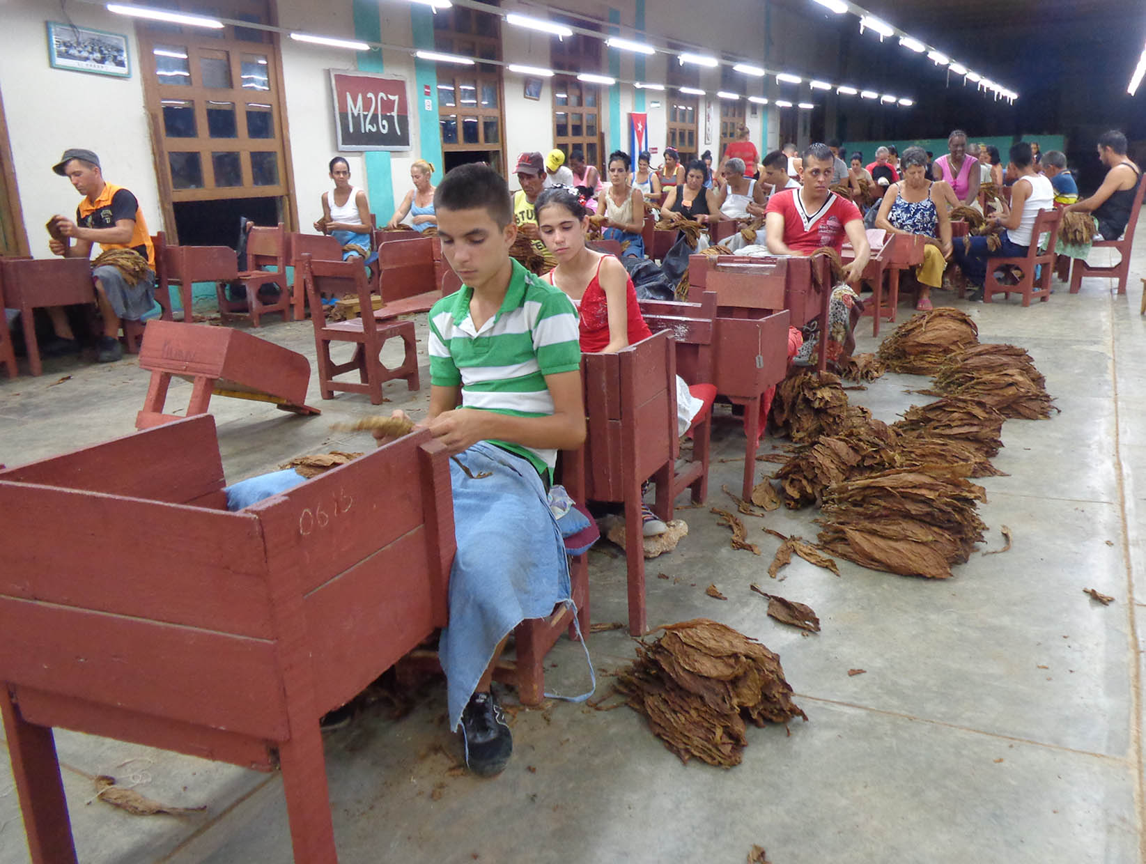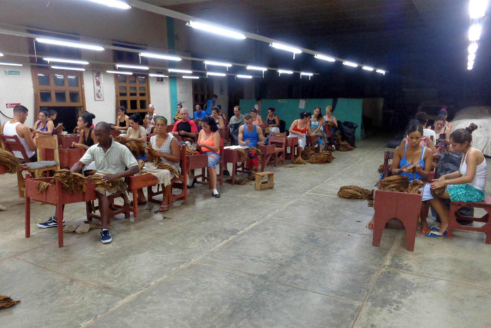 “Si nos dejan, nos quedamos hasta las once si hace falta”, cuenta la operaria al banco, quien ya concluida la jornada, beneficia tabaco en este centro del municipio San Juan y Martínez, Pinar del Río.