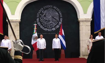 En el emblemático edificio de la gobernación del estado, en el Zócalo de Mérida, el presidente cubano pasó revista al batallón de ceremonias de las fuerzas armadas mexicanas, que le rindió honores.