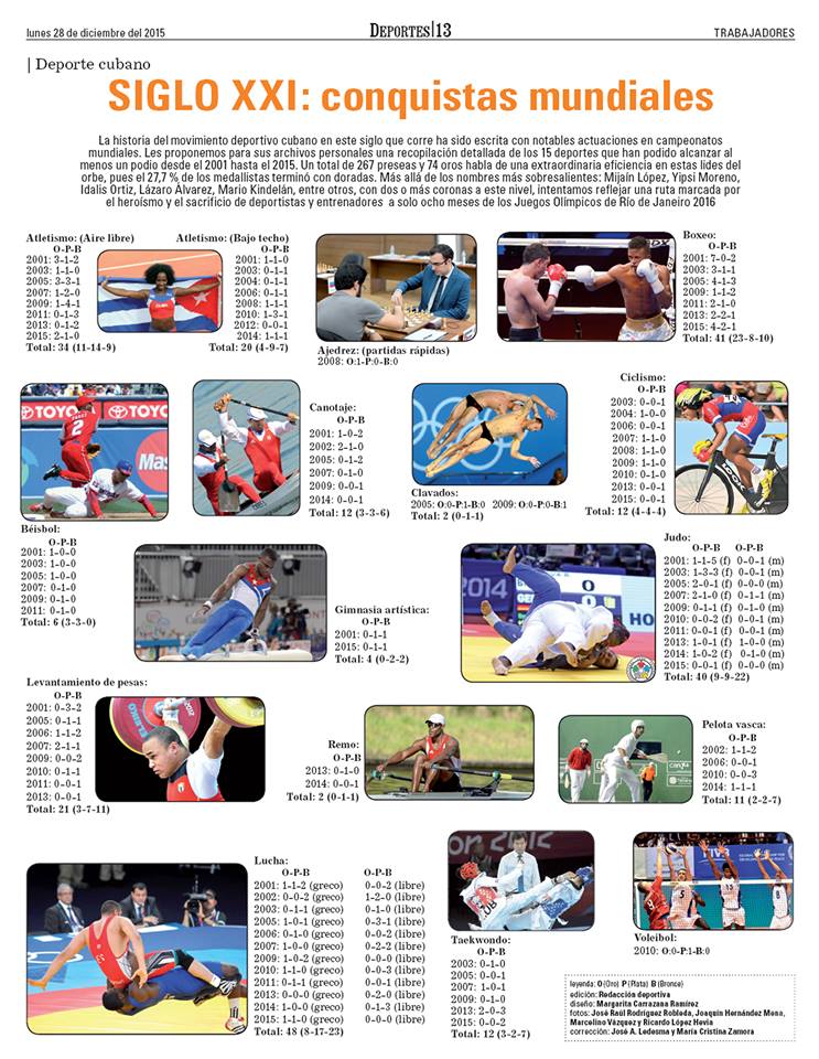 La historia del movimiento deportivo cubano en este siglo que corre ha sido escrita con notables actuaciones en campeonatos mundiales. Le proponemos para sus archivos personales una recopilación detallada de los 15 deportes que han podido alcanzar, al menos, un podio desde el 2001 hasta el 2015. Un total de 267 preseas y 74 oros habla de una extraordinaria eficiencia en estas lides del orbe, pues el 27,7 por ciento de los medallistas terminó con doradas. Más allá de los nombres más sobresalientes: Mijaín López, Yipsi Moreno, Idalis Ortiz, Lázaro Álvarez, Mario Kindelán, entre otros, con dos o más coronas a este nivel, intentamos reflejar una ruta marcada por el heroísmo y el sacrificio de deportistas y entrenadores a solo ocho meses de los Juegos Olímpicos de Río de Janeiro 2016.
