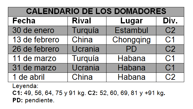 En América esa cita tendrá lugar hacia marzo en Argentina, y Cuba irá a buscar los boletos pendientes en 56, 69,91 y +91 kilogramos, así como aquellos otros a los cuales se vea forzada a renunciar por bajos rendimientos o indisciplinas de los atletas ya clasificados, a decir Joahnys Argilagos (49 kg), Yosbany Veitía (52 kg), Lázaro Álvarez (60 kg), Yasniel Toledo (64 kg), Arlen López (75 kg) y Julio César La Cruz (81 kg).