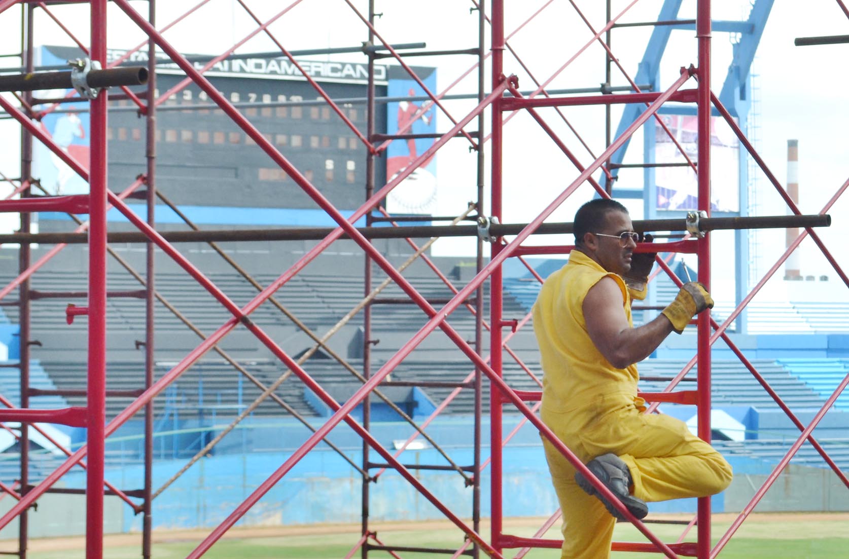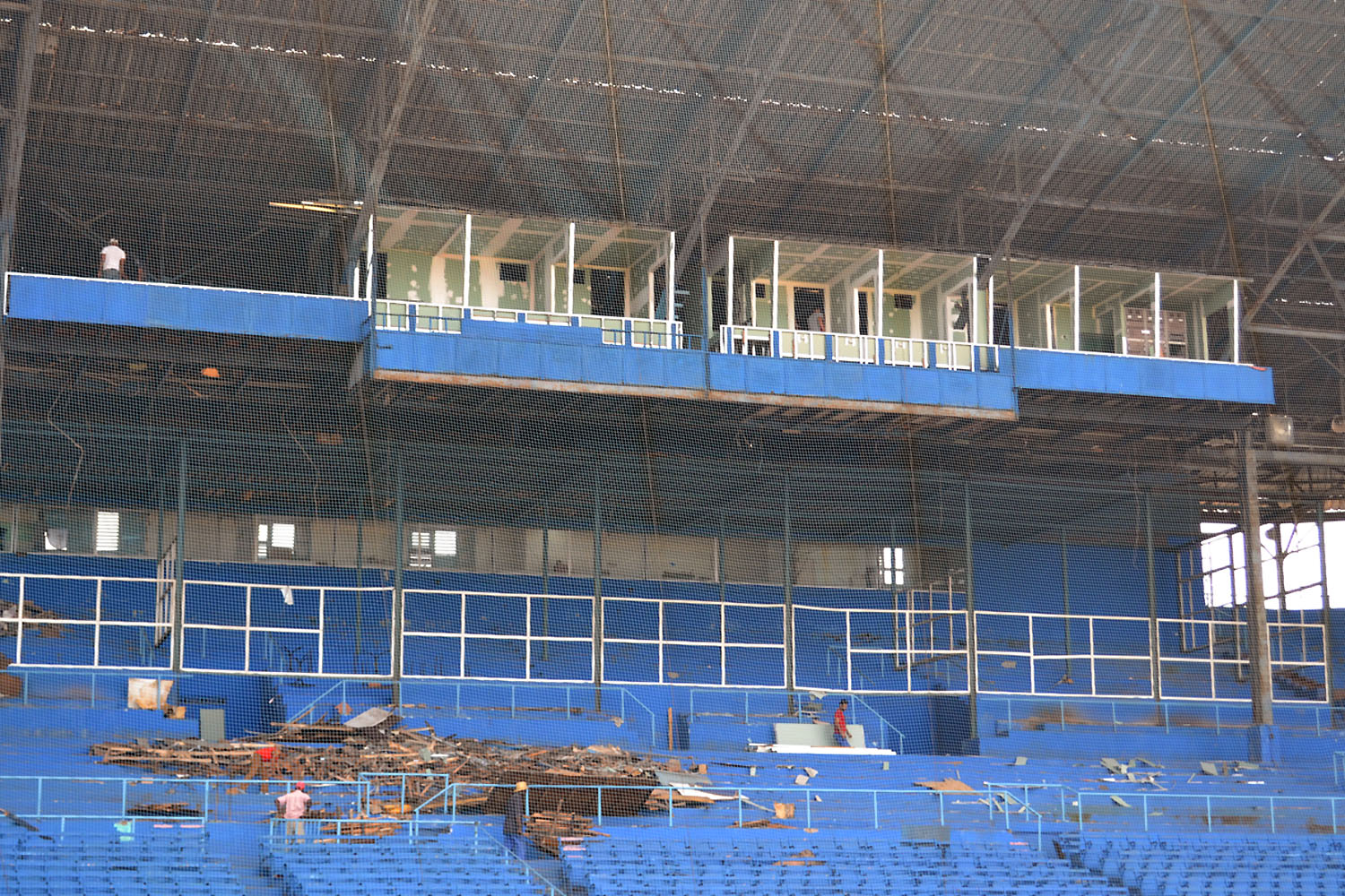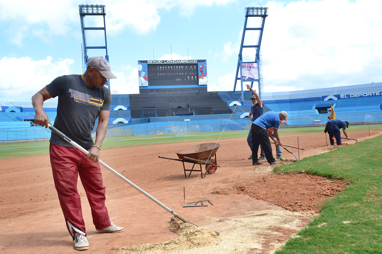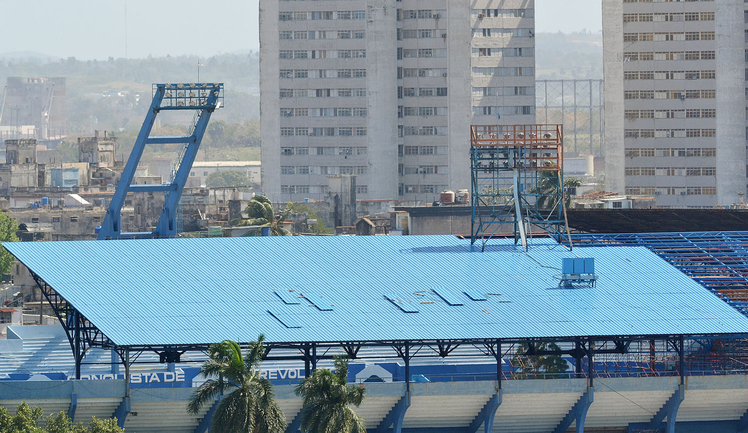 A ritmo forzado se trabaja en concluir la cubierta de la banda izquierda del parque capitalino, la cual muestra ahora mismo el avance impetuoso de un azulísimo techo nuevo. También se mejoran las torres del alumbrado artificial, se sustituye el viejo acolchonamiento y se embellecen las áreas exteriores del Coloso del Cerro.