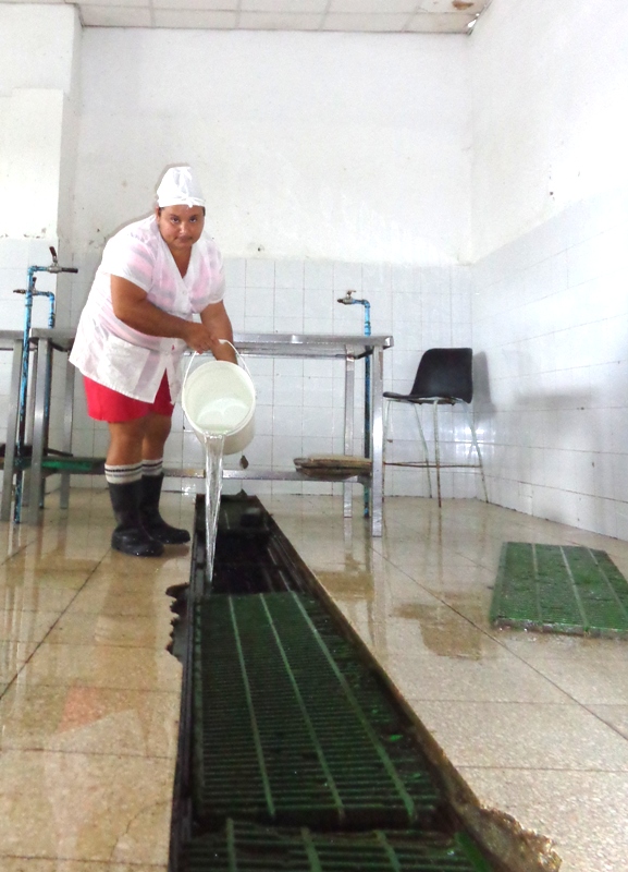 Pero, “todos los días hacemos un recorrido desde la cisterna, en el exterior de la nave, y revisamos que el flujo de agua sea continuo por los canales de desagüe. Al final de la jornada desinfectamos con los productos químicos normados, barremos las zanjas internas del área de procesamiento hasta el canal de desagüe, que está conectado al C-P4, conductora que evacua los desechos de la ciudad”, enfatiza Adalberto Leyva Segura, especialista en Gestión de la Calidad en la UEB.