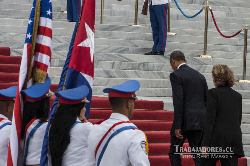 10: 33 a.m. El presidente Barack Obama llegó al Memorial José Marti a depositar una ofrenda floral ante el Monumento al Héroe Nacional cubano, en la Plaza de la Revolución de La Habana. Lo acompaña en el homenaje Salvador Valdés Mesa, vicepresidente del Consejo de Estado.