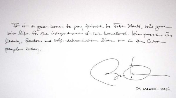 10: 52 a.m Obama firma libro de visitantes en el Memorial José Martí: «Es un gran honor hacer este homenaje a José Martí, quien dio su vida por la independencia de su país. Su pasión por las libertades civiles, por la libertad y la autodeterminación vive todavía hoy en el pueblo cubano», escribió en el libro de visita el presidente Barack Obama