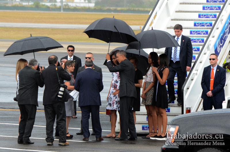4: 35 pm: El presidente estadounidense, Barack Obama llegó a tierra cubana acompañado de su familia y una amplia comitiva para iniciar la visita oficial de tres días a la capital de la mayor de las Antillas.