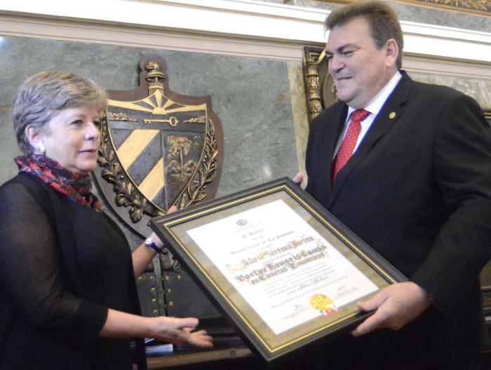 El doctorado otorgado a Bárcena fue propuesto por la Facultad de Economía. El acto solemne tuvo lugar en el Aula Magna de la Universidad de la Habana y contó además con la presencia de Rodolfo Alarcón Ortiz, ministro de Educación; Rodrigo Malmierca Díaz, ministro de Comercio Exterior y la Inversión Extranjera; Juan José Bremer de Martino, embajador de México en Cuba y otras personalidades de la cultura y la política de la isla.