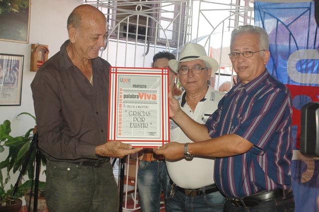 El espacio Palabra Viva, proyecto cultural recreativo que tiene por sede la Casa de la Prensa de Holguín, resultó ocasión propicia para que Félix Hernández, presidente de la Upec, le entregara un diploma de reconocimiento a Arcel Rodríguez, director de Tele Cristal, y Ricardo Gual, periodista.