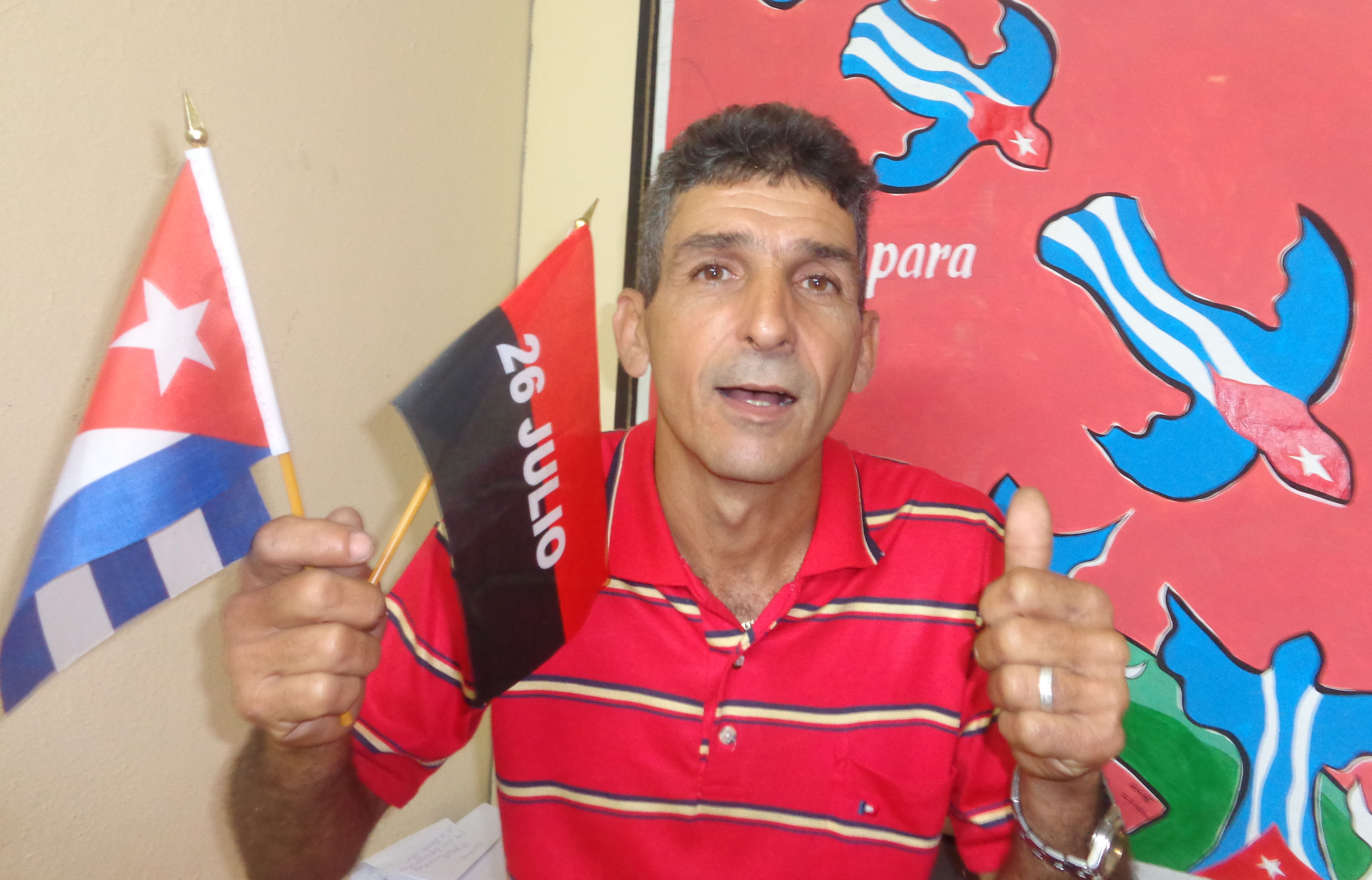 Como secretario general de la sección sindical constituida por 62 cuentapropistas del transporte en el municipio de Palma Soriano, Rogelio Corujo sabe llevar la voz cantante, por eso alzó la suya para en medio del desfile dar vivas por aquello con lo que él y sus compañeros se sienten comprometidos.