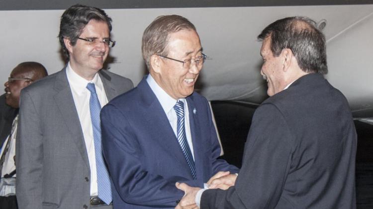 El Sr. Ban Ki-Moon, secretario general de la ONU, arribó esta noche al aeropuerto internacional José Martí para presenciar la firma del Acuerdo de Cese al Fuego, de las Hostilidades Bilaterales y Definitivo, la dejación de las armas y garantías de seguridad, acordado por la Mesa de Conversaciones para la Paz en Colombia.