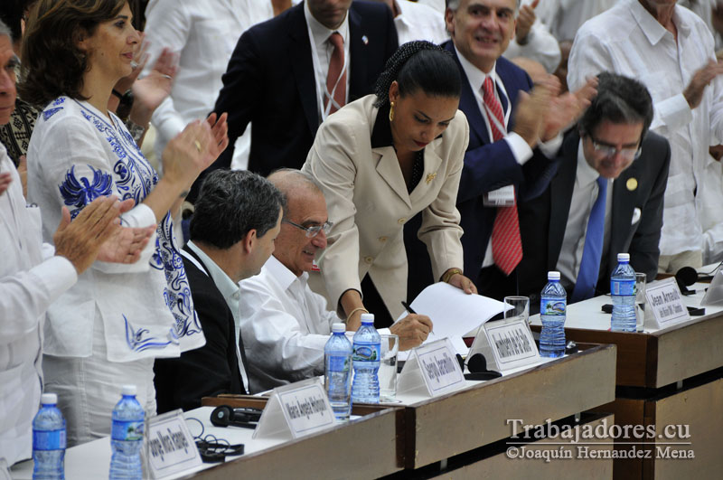 “Este Acuerdo no es la capitulación de la insurgencia sino el resultado de un diálogo serio entre fuerzas que no pudieron vencerse una a la otra luego de más de medio siglo de enfrentamientos”, reconoció en su discurso el jefe del estado Mayor Central de las Farc-Ep, Timoleón Jiménez, quien recordó al líder venezolano Hugo Chávez, artífice de estas negociaciones y «guerrero por la paz de América Latina y el Caribe», como le nombró.