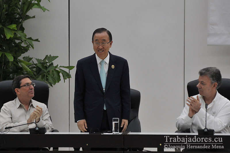El secretario general de la Onu, Ban Ki-moon, instó a las partes a materializar las esperanzas de paz alimentadas con este pacto y aseguró que la institución que dirige les apoyará en el intento: “El proceso en Colombia nos impone un compromiso esencial: un acuerdo de cese el fuego y posesión de las armas. El proceso de paz colombiano valida la perseverancia de todos aquellos en el mundo que trabajan para poner fin al conflicto no mediante la destrucción del adversario, sino mediante la búsqueda paciente de una solución conciliatoria”. “Trabajemos juntos para que la promesa de la paz que se sella hoy en la Habana se haga posible en Colombia”, concluyó.