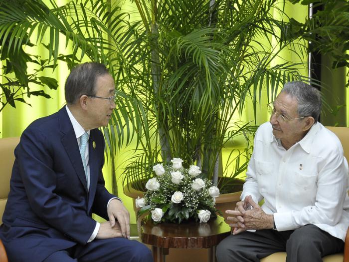 El General de Ejército Raúl Castro Ruz, Presidente de los Consejos de Estado y de Ministros, recibió en horas de la tarde de este jueves al excelentísimo señor Ban Ki-moon, Secretario General de la Organización de las Naciones Unidas, quien viajó a La Habana para participar en la ceremonia de Firma de Acuerdos entre el Gobierno colombiano y las FARC-EP.