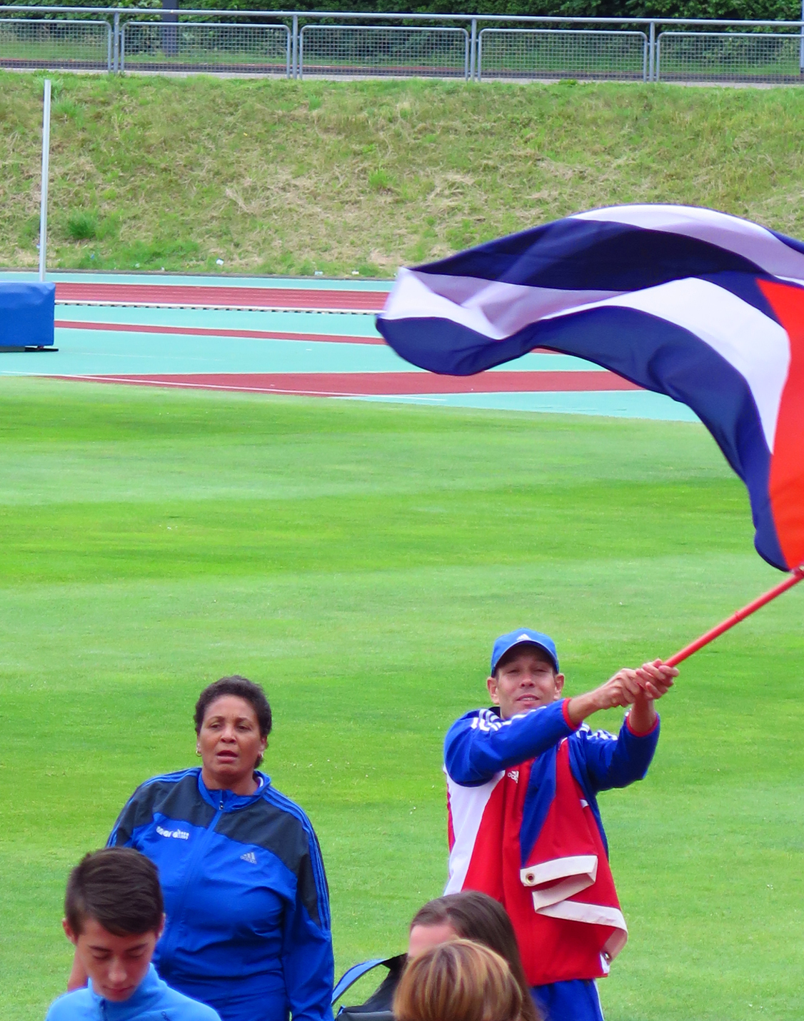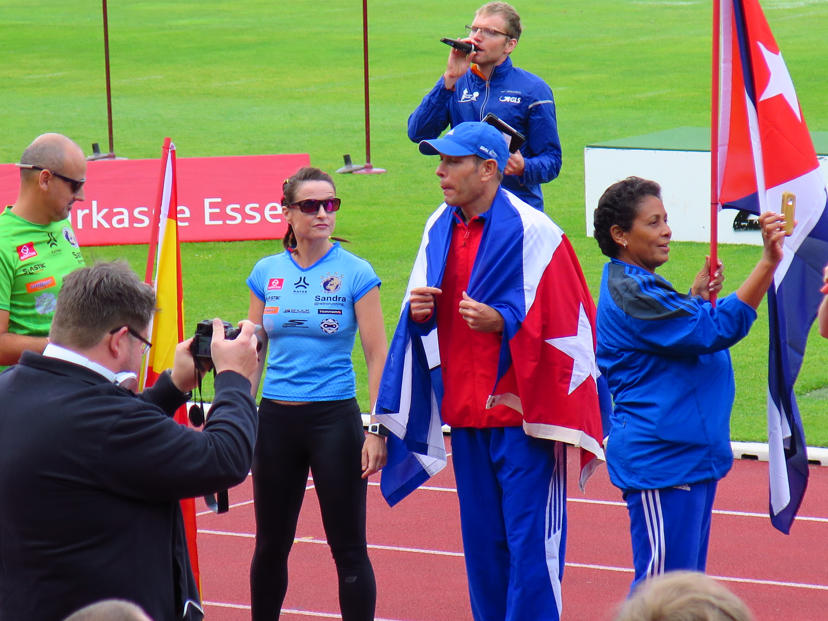 El capitalino Wilfredo Díaz García y su entrenadora Madelén Aguilar hicieron digna presencia en la ceremonia de apertura del VI Campeonato Mundial de Retrorunning, acontecida la tarde noche del jueves en Essen, Alemania.