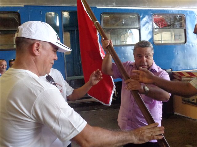 Ulises entregó la bandera de Vanguardia Nacional al taller de coches ferroviarios de Caibarién. Foto: Lourdes Rey