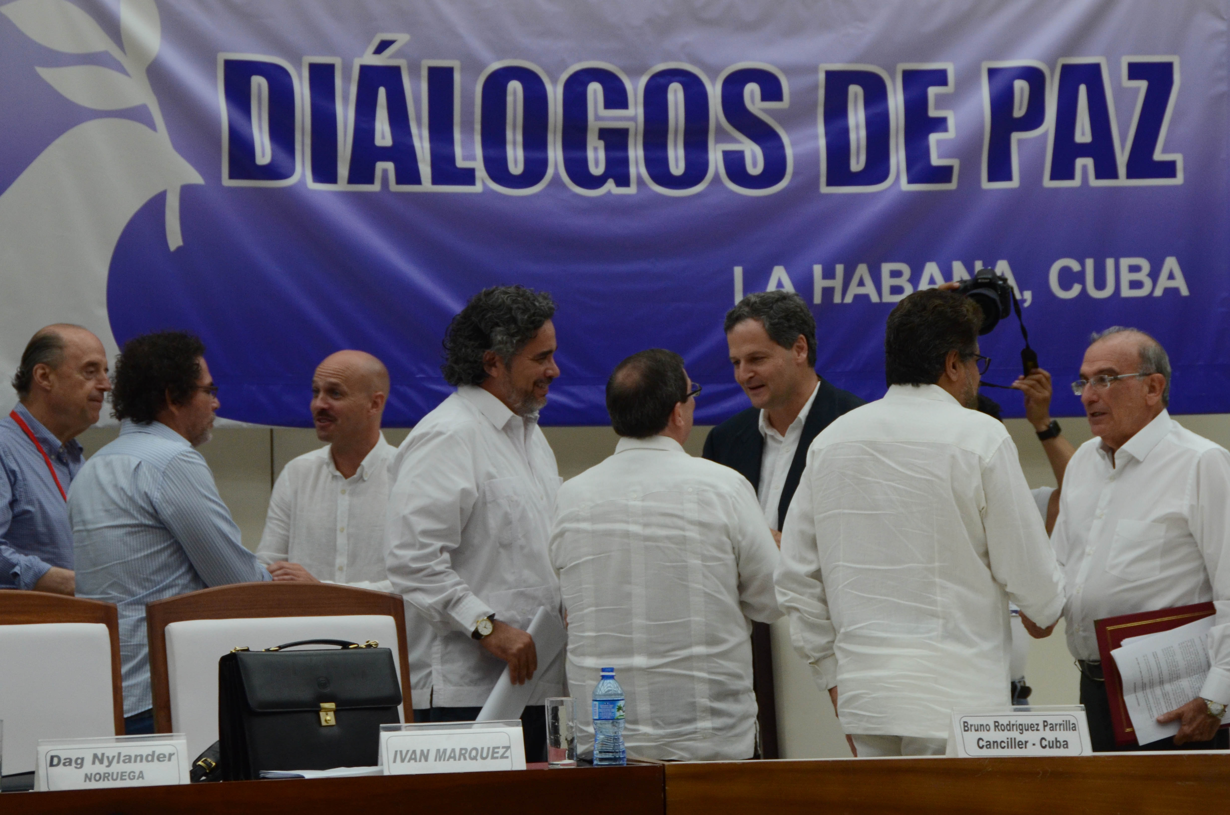 Bruno Rodríguez Parrilla, canciller cubano, recibió complacido al cierre del acto dos copias del histórico documento, firmadas por ambas partes, con lo cual comienza el fin de este conflicto armado interno que ha durado más de 50 años, y concluyen casi cuatro año de las negociaciones iniciadas en octubre de 2012, en Oslo, Noruega, y que desde noviembre de ese año  continuaron en la capital cubana hasta el día de hoy.