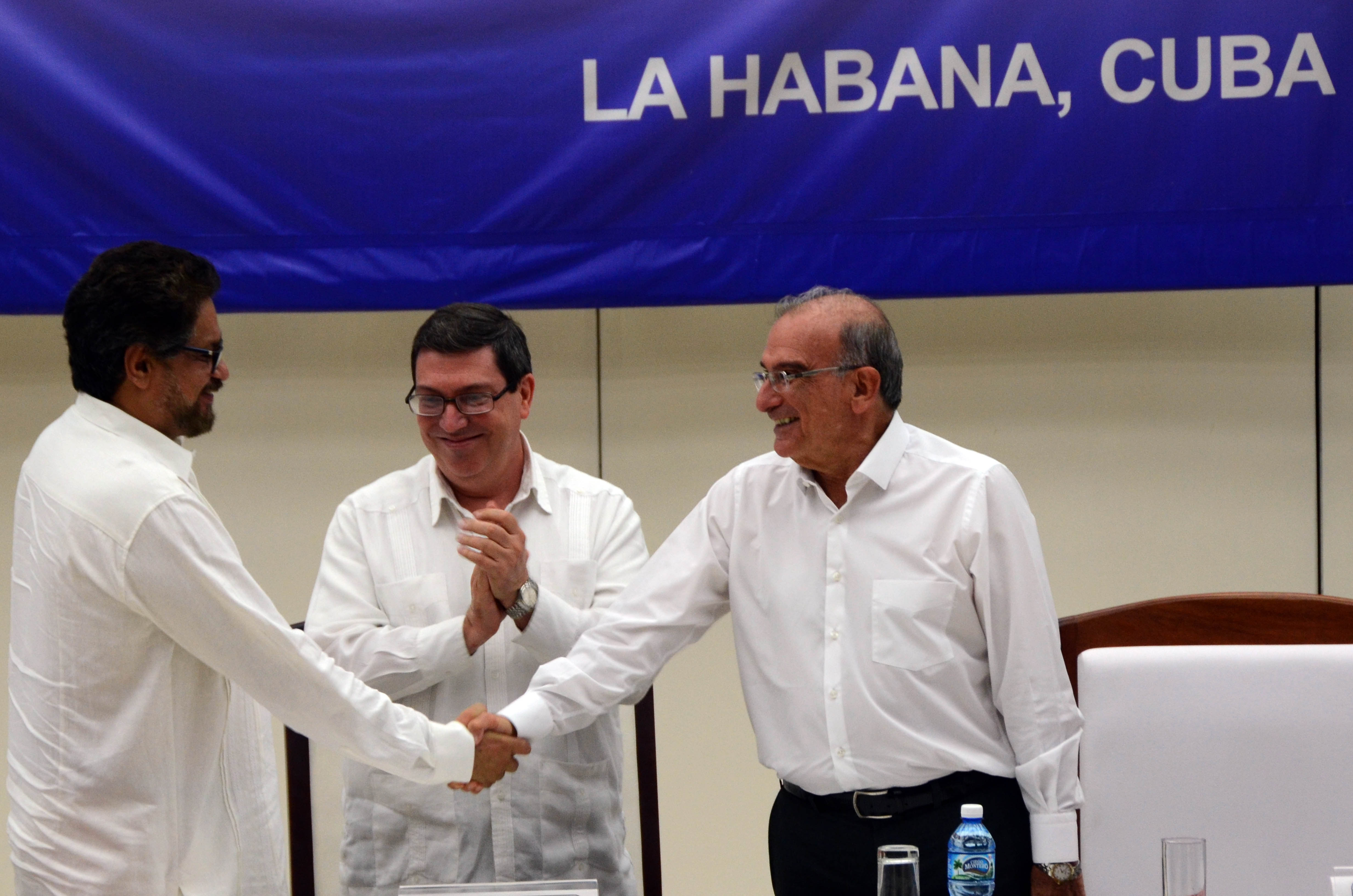 Bruno Rodríguez Parrilla, canciller cubano, recibió complacido al cierre del acto dos copias del histórico documento, firmadas por ambas partes, con lo cual comienza el fin de este conflicto armado interno que ha durado más de 50 años, y concluyen casi cuatro año de las negociaciones iniciadas en octubre de 2012, en Oslo, Noruega, y que desde noviembre de ese año continuaron en la capital cubana hasta el día de hoy.