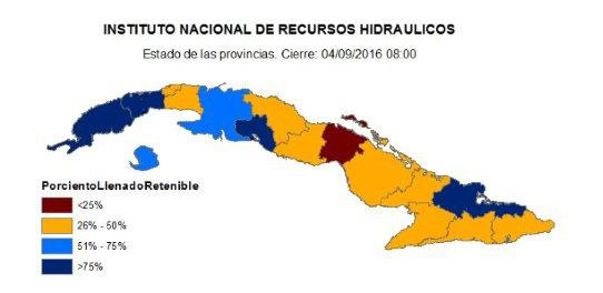 El parte diario del Servicio Hidrológico del Instituto Nacional de Recursos Hidráulicos (INRH) reporta que hasta las ocho de mañana de este domingo, las 242 presas administradas por dicho organismo acumulan el 52,2 % de su capacidad total, que representa una cifra superior a los cuatro mil 764,2 millones de metros cúbicos (m³).