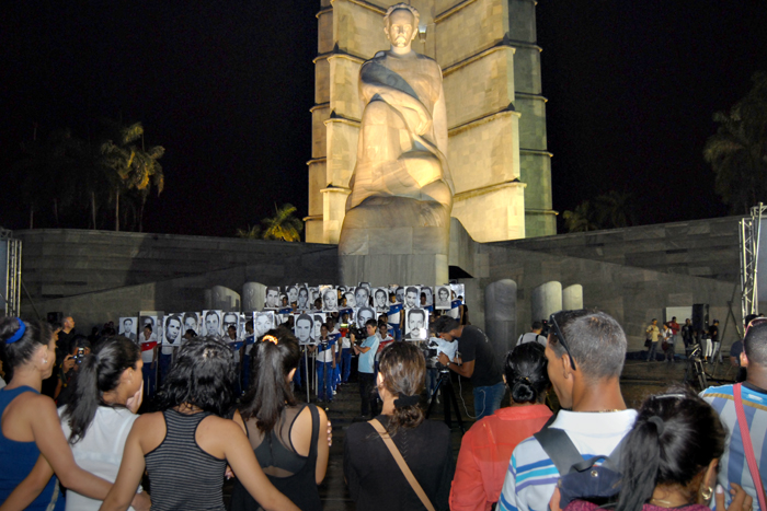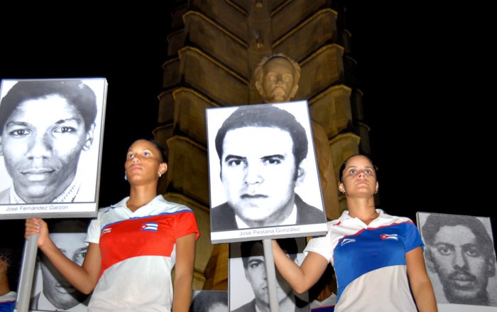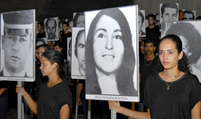 Con los retratos de las 73 víctimas que viajaban a bordo de la aeronave, los estudiantes procedentes de diferentes planteles de la enseñanza superior realizaron una guardia de honor al pie de la estatua del Héroe Nacional cubano ante la cual habló Thalía Gattorno Espinosa, nieta del copiloto de la aeronave derribada por explosivos colocados por dos agentes pagados por la Agencia Central de Inteligencia (CIA).
