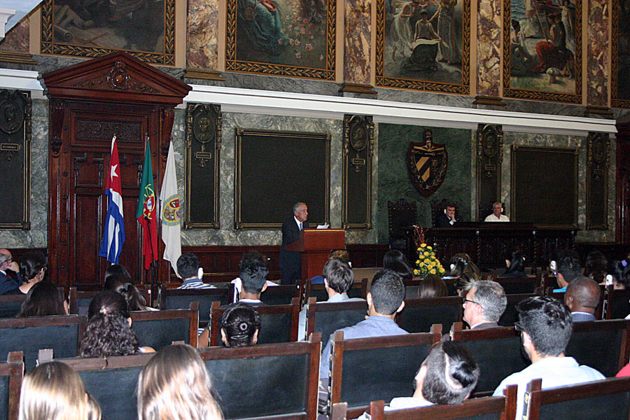Como parte del programa de su visita oficial a Cuba, el presidente portugués Marcelo Rebelo de Sousa impartió en la mañana de este jueves una conferencia magistral en el Aula Magna de la Universidad de La Habana (UH), acompañado por el primer vicepresidente de los Consejos de Estado y de Ministros, Miguel Díaz-Canel, y el rector de la UH, Gustavo Cobreiro.
