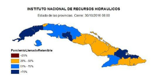 La propia fuente consigna que a nivel nacional, las presas acumulan el 56,6 % de su capacidad de llenado, equivalente a más de cinco mil 164 millones de metros cúbicos (m³), superior al cierre de septiembre, cuando el INRH reportó que los 242 embalses que administra tenían utilizables poco más de cuatro mil 241 millones de metros cúbicos.