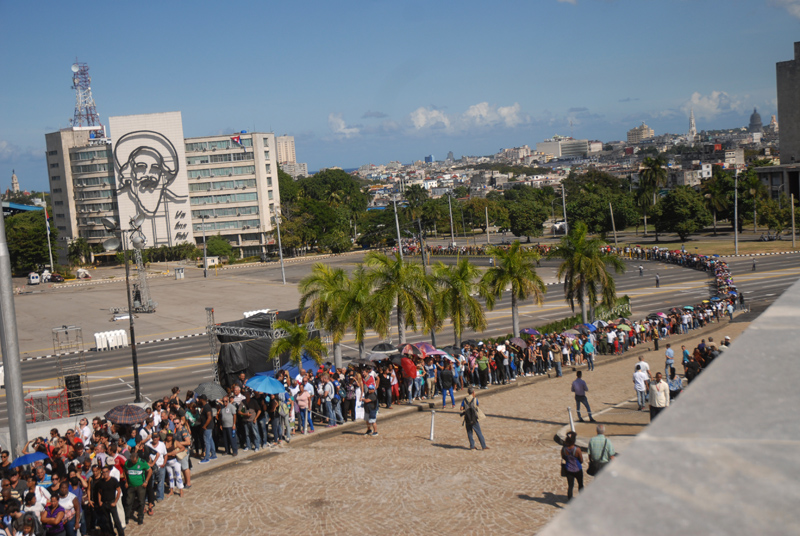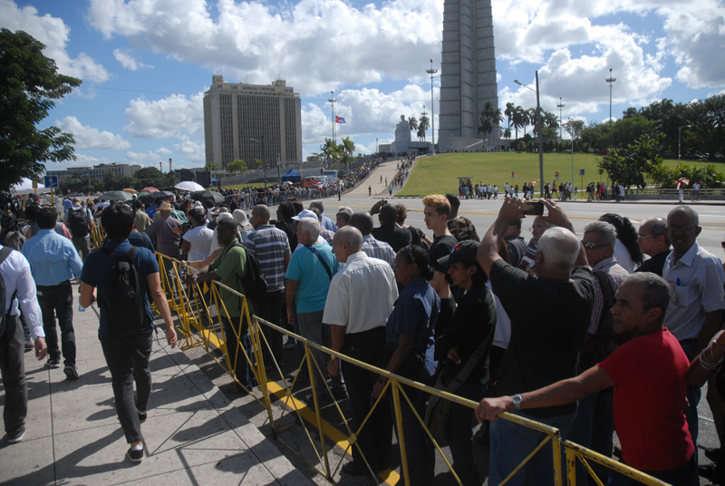 La plaza de la Revolución es el reflejo de cuán universal, querido y admirado ha sido y es el líder cubano Fidel Castro Ruz. A nuestro paso hacia el memorial José Martí, donde el pueblo capitalino, desde horas tempranas,  rinde tributo a su Comandante en Jefe, uno encuentra personas de los más diversos países. Llevan fotos de Fidel, pulóveres con la bandera cubana o la de sus naciones; ellos se unen a las largas filas de los miles de cubanos que esperan llegar hasta el memorial.