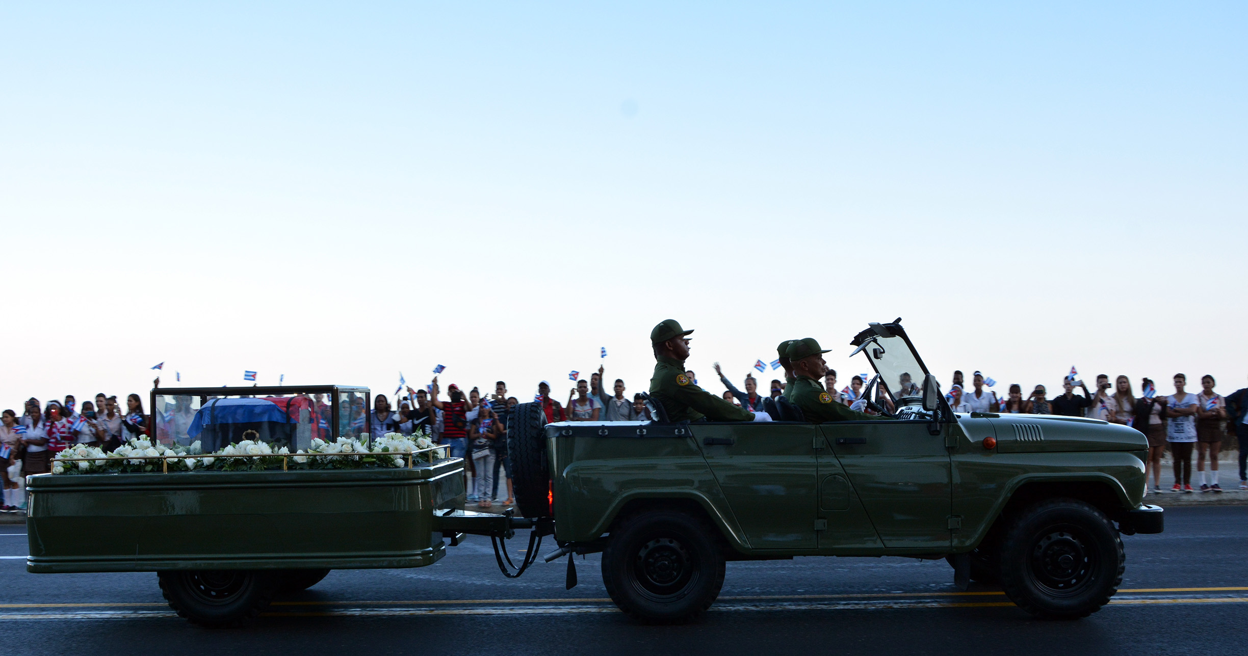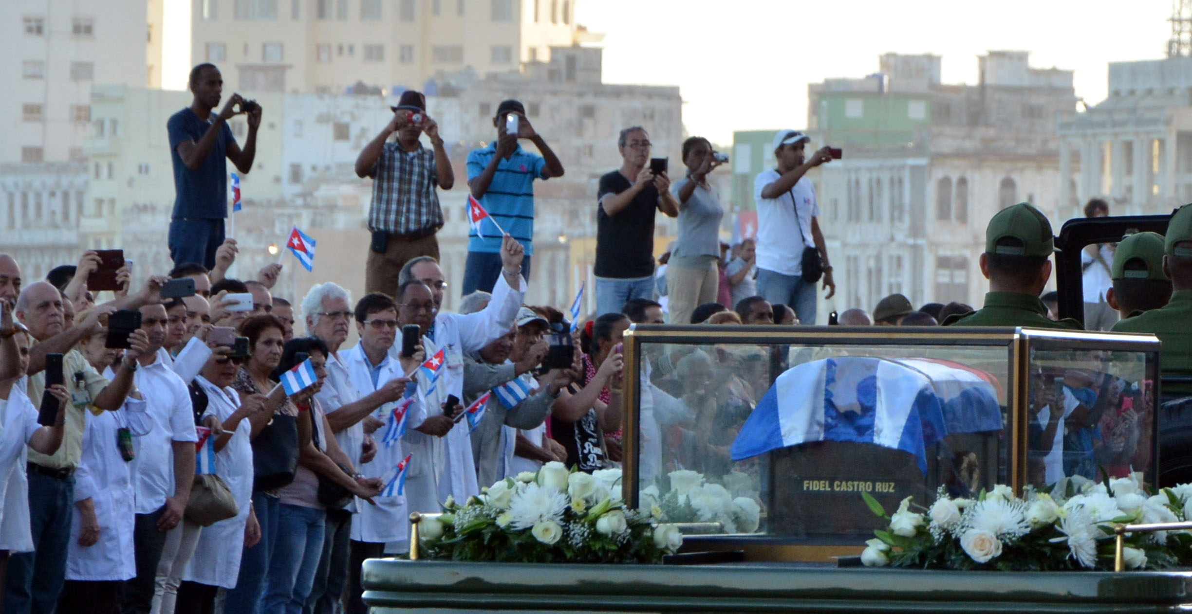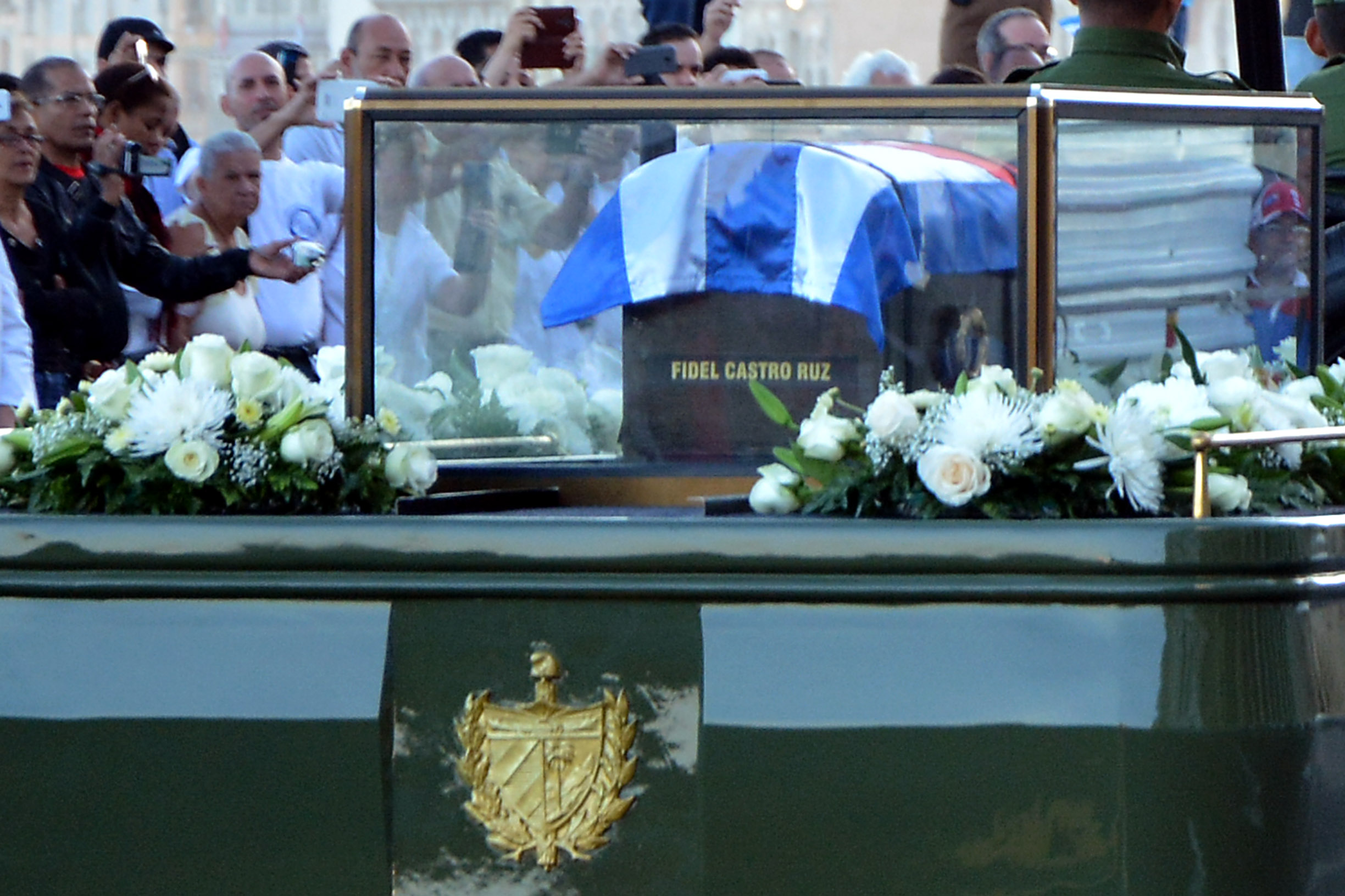 Son muchas las banderas cubanas agitadas por manos que nunca quisieron llegara este momento. Las lágrimas se deslizan libremente por rostros jóvenes y menos jóvenes, y no pocos las retiran de un manotazo, porque no quieren demostrar flaquezas ante quien fuera todo arrojo y firmeza; y seguirá velando porque este pueblo continúe invicto y gallardo, desde donde reposarán sus restos mortales, que serán inhumados el 4 de diciembre en el cementerio de Santa Ifigenia.