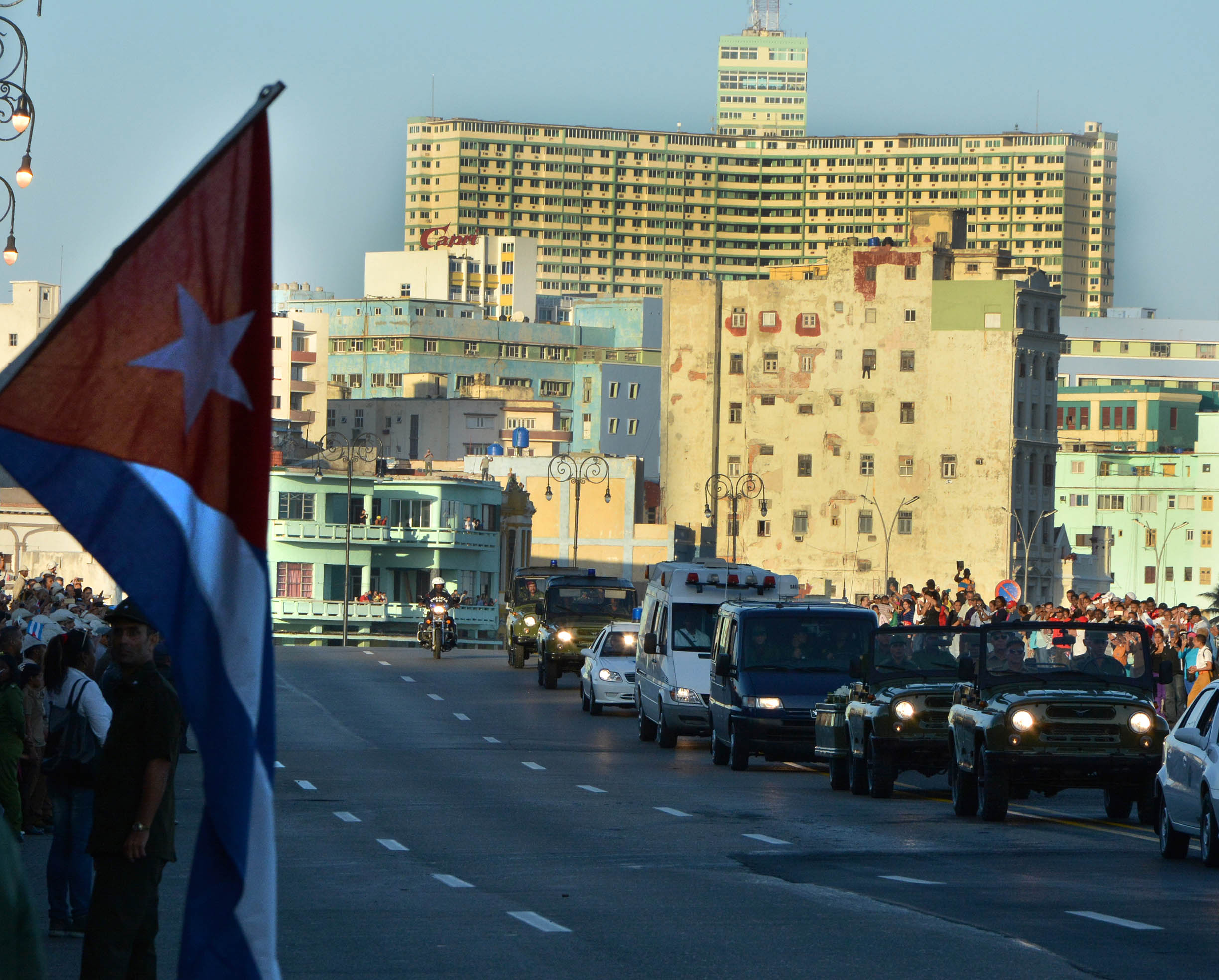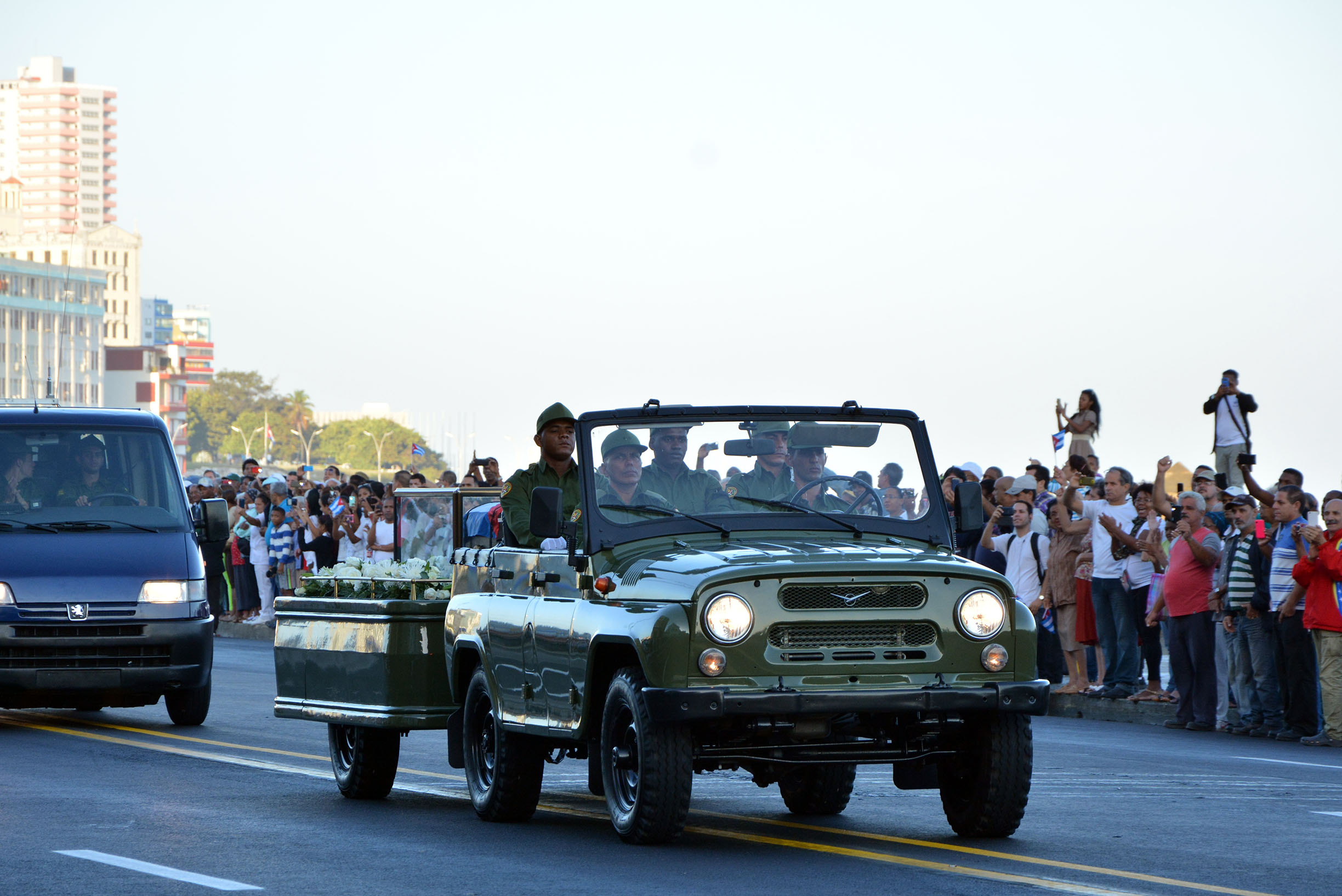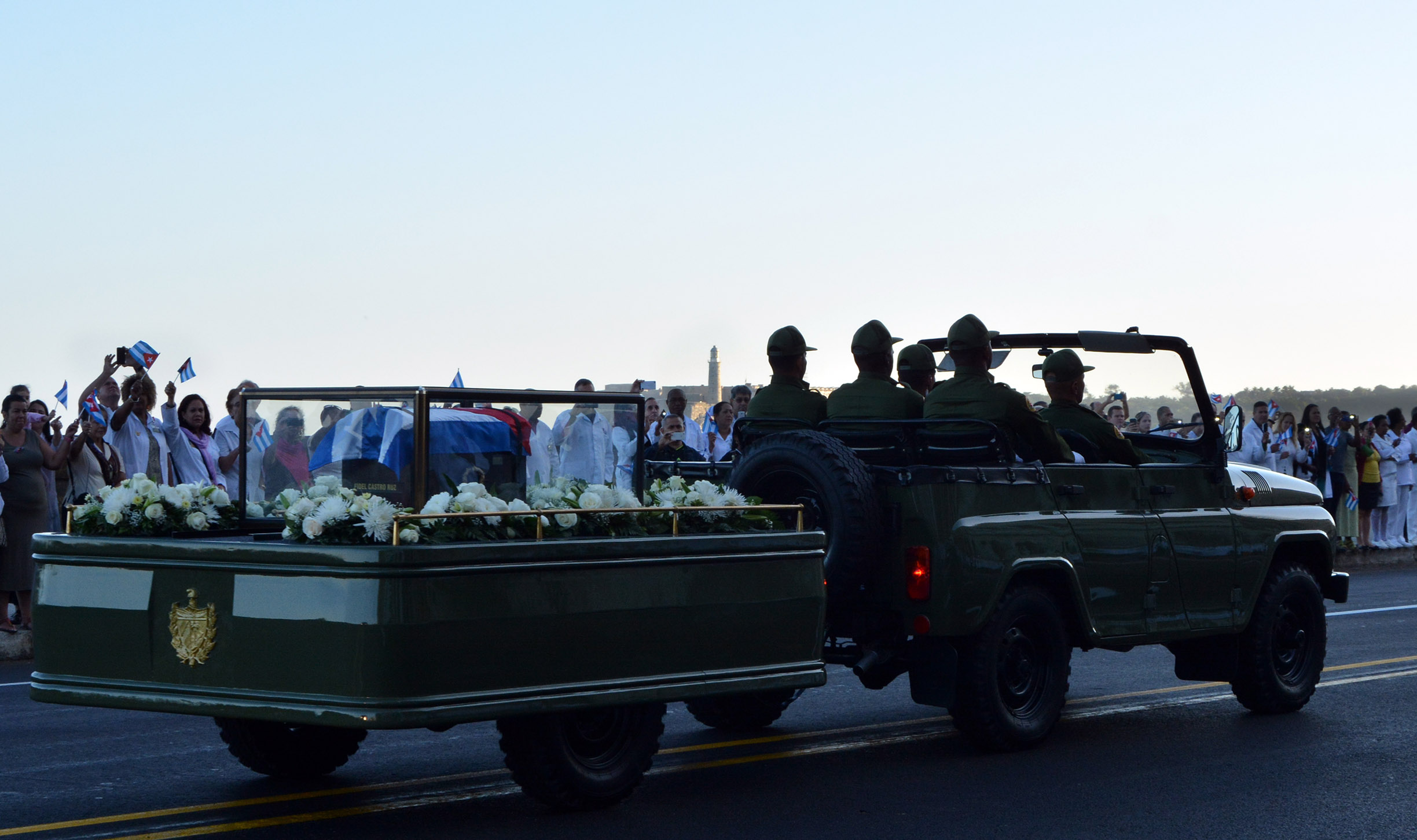 Con un saludo militar de los integrantes de las Fuerzas Armadas Revolucionarias y del Ministerio del Interior, y el ¡Viva Fidel! retumbó en el silencio con que comenzó este viaje hacia la eternidad y lo ha seguido por la primera etapa de este recorrido, por la avenida Paseo, la calle 23, el Malecón habanero, la avenida del Puerto…