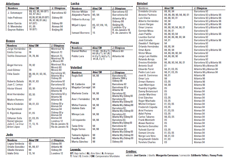 De esos 90 nombres, 19 corresponden a mujeres,   lidereadas por el voleibol (14) y judo (4). Los primeros    en conseguir este abrazo ilustre fueron  los boxeadores Teófilo Stevenson y Emilio Correa  en   1974; en tanto los más recientes fueron el luchador    Ismael Borrero y los pugilistas Julio César La Cruz    y Arlen López en el 2016.