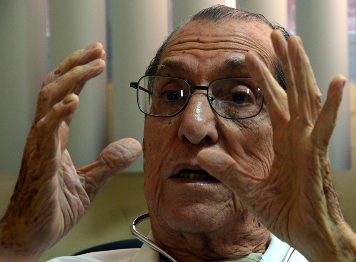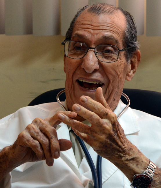 Ni siquiera así, con ese premio, culminaría su etapa laboral. Pocos días después nos recibió en su consulta, ataviado con la larga bata blanca, su estetoscopio colgando del cuello, y varios minutos de retraso, pues antes que a los periodistas, atendió a un amigo que le pidió le escribiera el prólogo de un libro y a una paciente que exigió un examen del galeno. Sonríe, saluda con caballerosidad y se dispone al diálogo.
