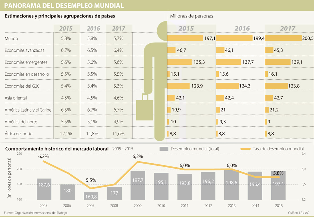 Aun cuando los Gobiernos y las organizaciones internacionales han adoptado políticas para revertirla y evitar los efectos de la desaceleración, indicadores como el desempleo son cada vez más alarmantes. Al cierre del 2016 sumaban 25 millones de desocupados en la región, la cifra más alta en los últimos diez años, según publicó la Organización Internacional del Trabajo (OIT); situación agravada por el deterioro de las economías regionales.