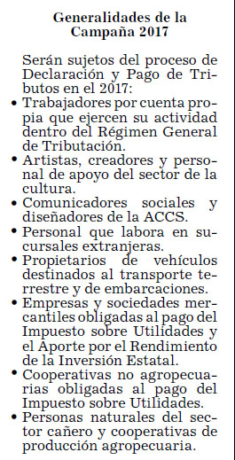 En la actual campaña de declaración y pago anual de tributos, por ejemplo, continúa en vigor la posibilidad de un descuento del 5 % del impuesto a pagar para quienes declaren antes del 28 de febrero.