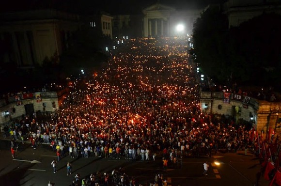 En toda Cuba, la noche de hoy será testigo del destello de las antorchas que en manos del estudiantado y la clase obrera perpetúan el legado del Héroe Nacional y tributan homenaje a la memoria del Comandante en Jefe, que por primera vez no estará físicamente entre nosotros, pero su impronta perdura cual marca de nacimiento en nuestra acción.
