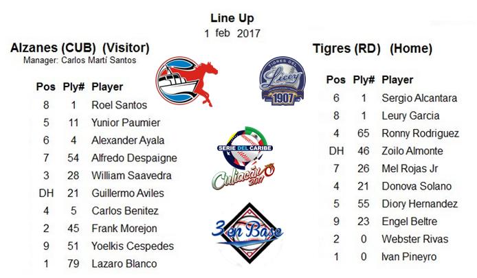 La alineación de Dominicana: Sergio Alcántara (ss), Leuris García (cf), Ronny Rodriguez (1b), Zoilo Almonte (bd), Mel Rojas Jr (lf), Donovan Solano (2b), Diory Hernández (3b), Engel Beltre (rf), Webster Rivas © y Iván Piñeyro (lanzador)