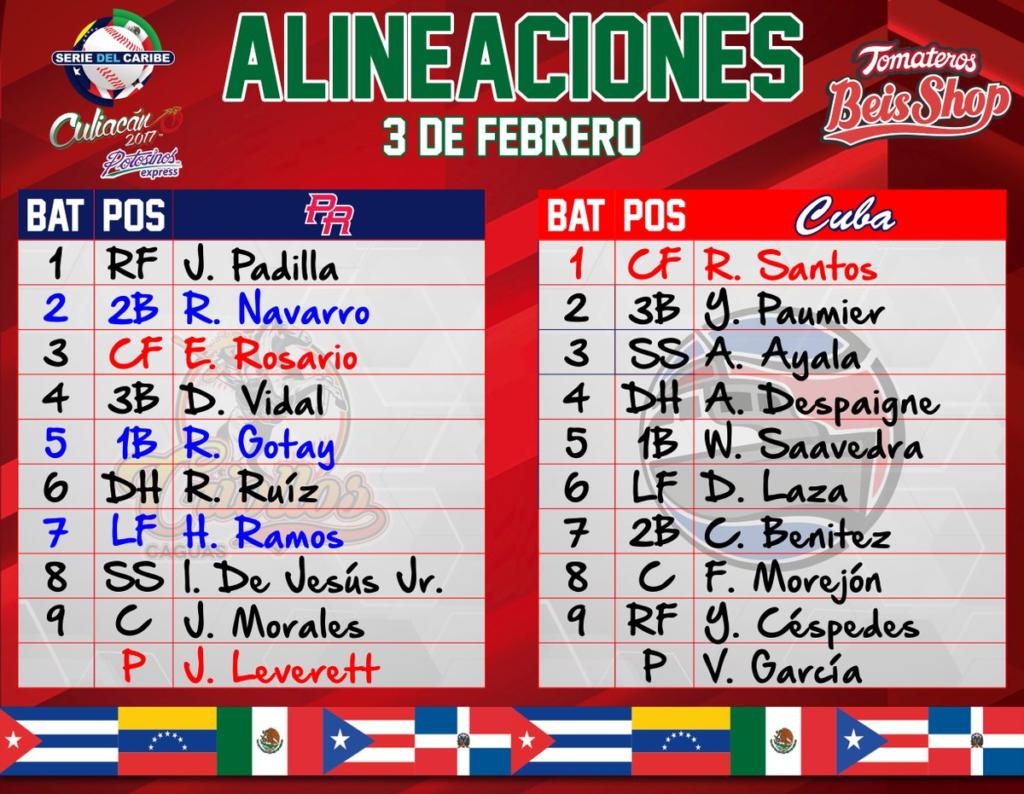Joel desde la sede: Sin grandes complicaciones retiró el lanzador boricua a los tres primeros de la tanda cubana. otra vez Ayala le volvió a dar bien a la bola y fue víctima de un gran fildeo del torpedero Jesus. El duelo entre Cuba y Puerto Rico en la historia de estos certámenes se mantiene igualado a 13 triunfos de por vida. Hoy quedará roto el abrazo.