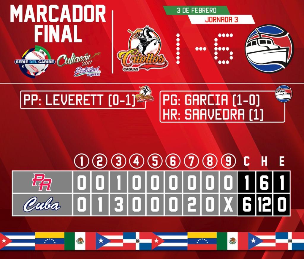 Final del tercer inning: Paumier conectó doble al central. Ayala dio hit al RF. Hombre en primera y tercera. Despaigne impulsa la segunda de Cuba con hit por encima de segunda. Saavedra impulsó la tercera con doble por el RF. Gana Cuba 3 carreras por 1. Laza recibe pelotazo. Benítez conecta largo batazo por el RF e impulsa la cuarta de Cuba, muy bien el camarero cubano. Morejón da rolling a segunda y fuerzan.