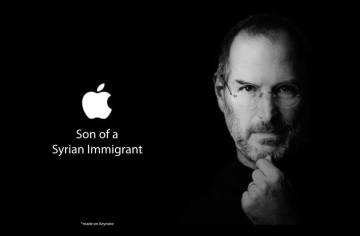 Jobs, exitoso empresario del sector informático, aparece en la imagen con un rótulo que alude a su procedencia: “El hijo de un inmigrante sirio”. Y con ello, la comunidad norteamericana recuerda al mandatario electo la importancia de los nacidos en el exterior, o descendientes de ellos, para el desarrollo de su nación.