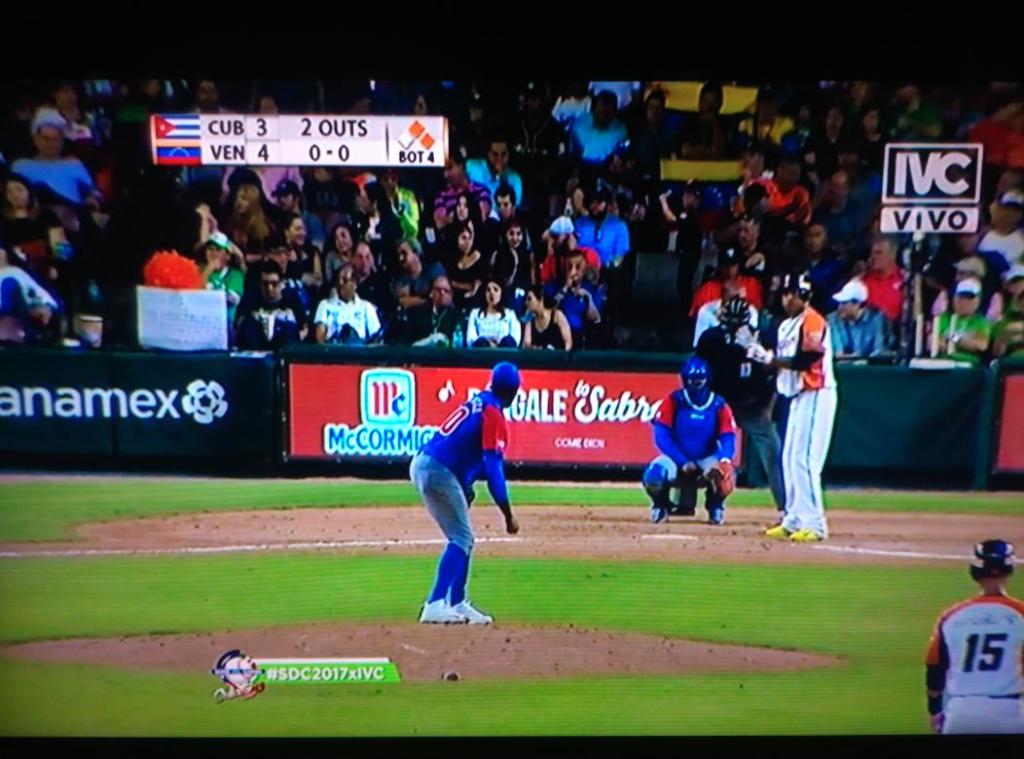 Final del 5to inning: El quinto bate Pirela fue dominado en un eleado a lo profundo del CF. Romero conectó hit al izquierdo y Phipps bateó un fly al LF. El 8vo bate Arcia hizo hit al derecho y fue suficiente para el cienfueguero Entenza, quién fue sustituido por el tunero Yoelkys Cruz. Castillo conectó hit al derecho y anotó la quinta carrera para los venezolanos. El 1er bate Galvis impulsó dos carreras más con un doble por el izquierdo y esto fue suficiente para Yoelkys, al que sustituyeron por el inxperto en lides internacionales César García. Romy Cedeño bateó hit al derecho y el hombre de segunda no quiso atacar el home. Hubo otro cambio de lanzador, Martí trajo al derecho Leandro Martínez para acabar de sacar el 3er out, y así lo hizo ponchando al tercer bate René Reyes. Termina el inning 7 a 3.