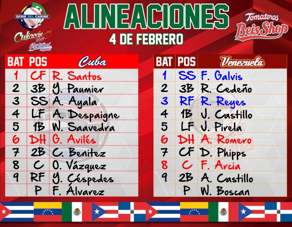 Principio 1er inning: Cuba sale como visitador y los dos únicos cambios en la alineación son los de Osvaldo Vázquez en la receptoría y Guillermo Avilés como designado, pasando Despaigne al LF.Roel Santos inició el partido conectando hit, el tercero para él en este torneo, pero Avilés conectó por tercera para doble play. Ayala roleteó por la antesala y fue el tercer out.