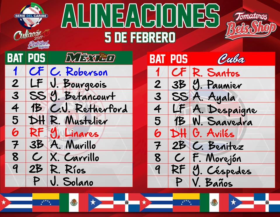 Joel desde la sede: Cuba ha vuelto a su alineación titular del primer día con la única variación en que Saavedra actuará como designadoy Avilés pasó a la inicial. El lanzador rival, Javier Solano es el número uno del staff de las Aguilas de Mexicalli y promete ser un buen duelo contra Baños.