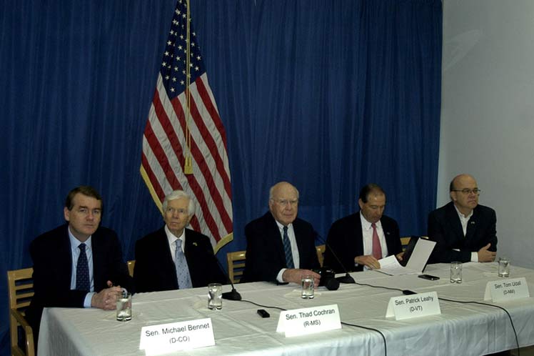 La comitiva, presidida por el senador demócrata Patrick Leahy y el representante republicano por Mississippi Thad Cochran, está conformada además por los también senadores del partido azul, Thomas Udall, de Nuevo México, y Michael Bennett, de Colorado, y los representantes demócratas James McGovern, y Seth Moulton, ambos de Massachusetts.