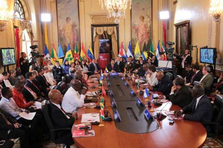 El presidente de Venezuela, Nicolás Maduro, en su condición de anfitrión del cónclave, es acompañado por los presidentes Raúl Castro (Cuba), Evo Morales (Bolivia) y Daniel Ortega (Nicaragua), más el primer ministro de San Vicente y las Granadinas, Ralph Gonsalves, y cancilleres de naciones de América Latina y del Caribe.