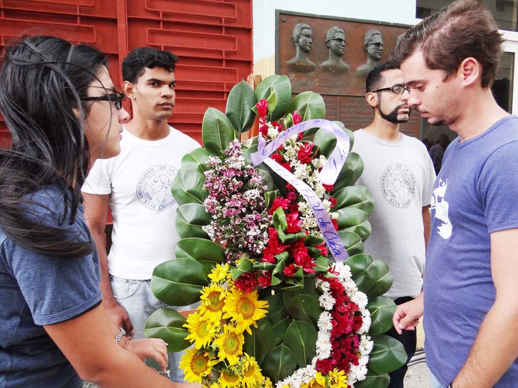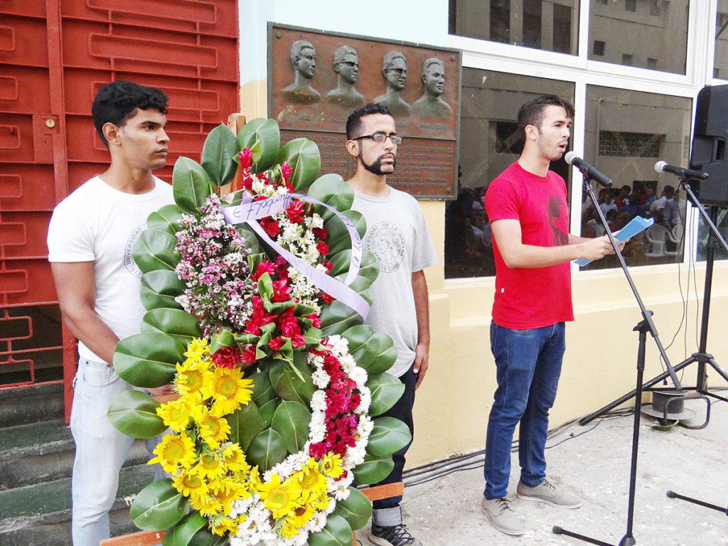 Frente al edificio marcado con el número 7 de la calle Humbolt, en Centro Habana, donde el 20 de abril de 1957 esbirros de la tiranía de Fulgencio Batista asesinaron a Fructuoso Rodríguez, José Machado, Joe Westbrook y Juan Pedro Carbó, estudiantes y jóvenes cubanos se dieron cita para rendirles homenaje.