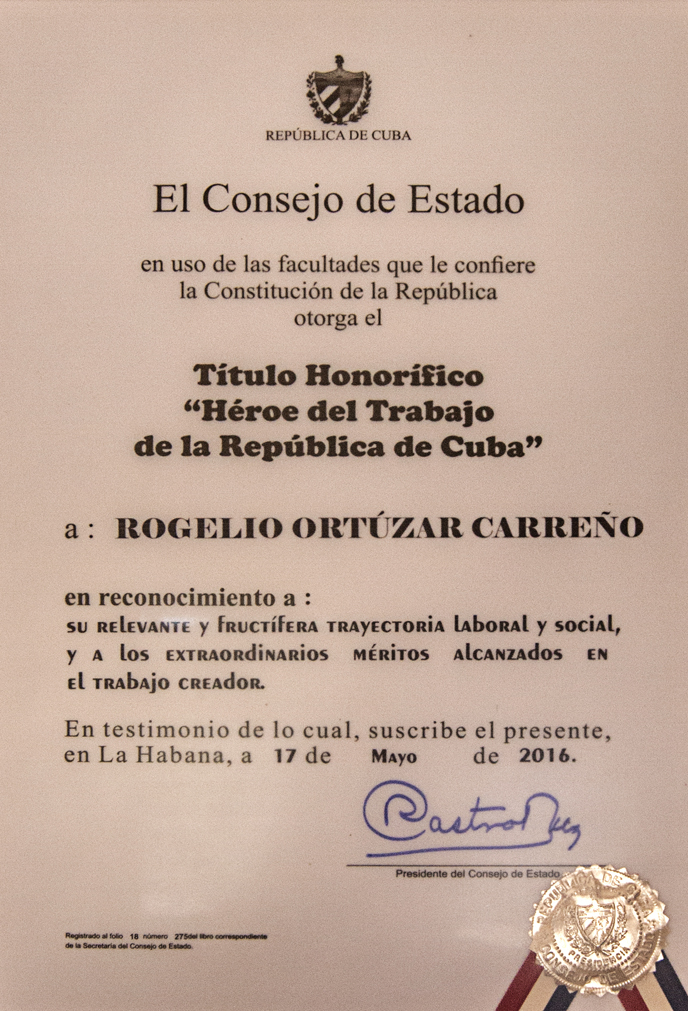 Rogelio Ortúzar Carreño, presidente de la cooperativa de créditos y servicios 26 de Julio, de Consolación del Sur, en Pinar del Río, quien hace un año recibió tal condecoración, basa todos sus méritos en los resultados productivos, económicos y sociales de la CCS que dirige hace más de 20 años: “Es el más alto reconocimiento que puede recibir un trabajador o campesino; el mayor estímulo que tiene mi familia y han tenido la cooperativa y la comunidad”.