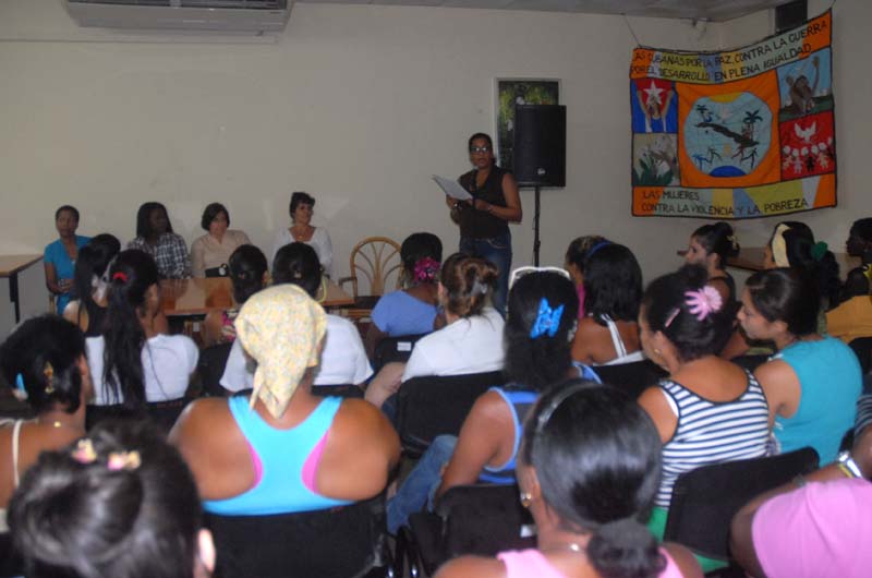 Elpidia Moreno Hernández, coordinadora nacional de la Marcha Mundial de Mujeres en Cuba, al intervenir en la actividad realizada en Mediatex, recordó que este es un movimiento que existe en más de 92 países, cuyo objetivo fundamental es eliminar las causas que originan la violencia y la pobreza contra la mujer.