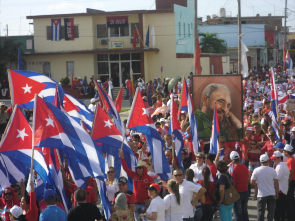 Más de cien mil espirituanos colorearon el entorno de la Plaza Mayor General Serafín Sánchez de la ciudad de Sancti Spíritus con los colores de la bandera cubana, durante el desfile conmemorativo por el Día Internacional de los Trabajadores.