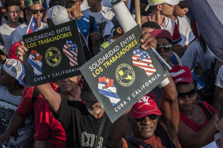 ¿Que estuvo en la Plaza de la Revolución José Martí la bandera de las barras y las estrellas? Sí, la vimos en carteles portados por hombres y mujeres que expresaban la solidaridad entre los trabajadores de Cuba y California en los que aparecían las enseñas nacionales de ambos países al mismo nivel, en forma de puños aguerridos, como símbolos de la lucha común por un mundo mejor, aunque librada en condiciones bien diferentes.