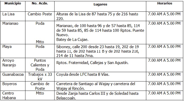 Empresa Eléctrica de La Habana comunica a los vecinos y entidades administrativas de La Lisa, Marianao, Playa, Arroyo Naranjo, Guanabacoa, Boyeros y Centro Habana, que por acciones de mantenimiento y rehabilitación programadas para este jueves 4 de Mayo ocurrirán interrupciones en algunos lugares de esos municipios en el horario de 7.00 am a 5.00 pm.