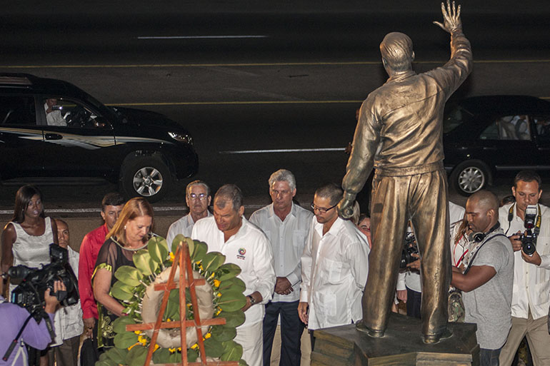 Tras colocar una ofrenda floral en el monumento a José Antonio Echeverría en el Instituto Superior Politécnico de igual nombre (ISPJAE), en La Habana, el presidente ecuatoriano Rafael Correa participó en la noche de este jueves de una gala cultural con la comunidad de su país residente en Cuba.
